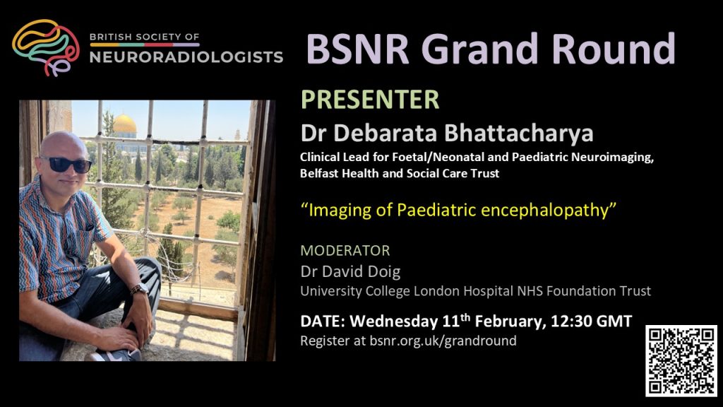 In 2020 the BSNR started the first ever online Neuroradiology Grand Rounds. This showcases interesting and educational cases from neuroscience institutions from around the UK with more recent international presentations from Toronto, Singapore, and Kuwait. It runs monthly under the guidance of Dr David Doig and Dr Shubhabrata Biswas. These are via Zoom, and occur on the 2nd Wednesday of every month.